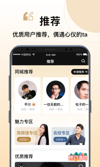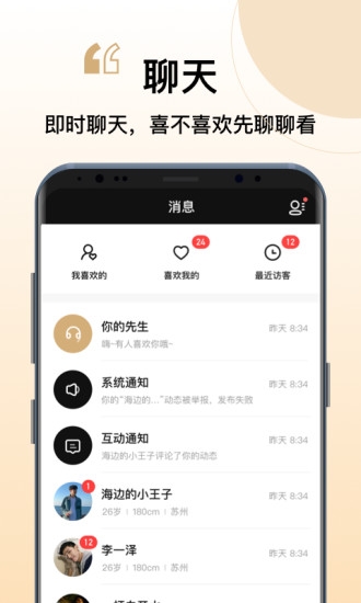 你的先生app官方是一款为广大的小姐姐们准备的高端婚恋交友的软件,在这里面的人士每一个都是有着房产,车辆和学历进行认证的,保证了信息的真实性,让你能够轻松的认识到了非常多优质的单身人士,从而能够快速的脱单。在你的先生app官方上,你可以把自己的生活动态都发布出来,从而能够吸引更多的用户们来进行观看认识,你可以在这里关注你喜欢的对象,表达自己的感受,互相关注之后,还能够进行私密的一对一的聊天,让你可以加深彼此的印象,有着同城推荐,或者是根据兴趣爱好推荐,或者是根据条件筛选等等,有需要就来下载你的先生app官方吧。