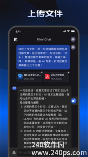 kimi智能助手下载免费是一款非常好用的AI对话软件,kimi智能助手下载免费可以帮助我们快速地去学习知识,你可以通过app和AI进行在线对话,可以去问任何问题,AI都能够为你解答。kimi智能助手下载免费中的界面超级清爽,而且可以满足小伙伴们多样化的智能服务需求,在这里你可以询问AI去制定出行计划,可以去了解某个成语的典故,这里还可以去上传文档来轻松获取文档中的关键信息,帮助大家更加高效地去办公学习。