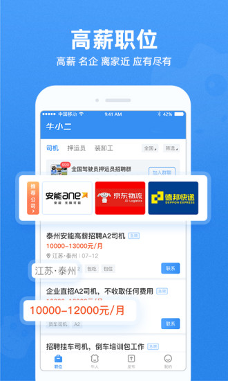 牛小二招聘app官方版是一家专为广大司机朋友们打造的找工作平台,里面全部都是真实可靠的司机招聘信息。你可以在这里免去简历填写的繁杂过程,直接联系老板进行沟通,并且有着绝对的信誉保障。