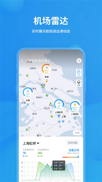 机场详情页面中,可以查看到炫酷的机场雷达、机场大屏、机场交通情况、机场流量、机场天气、机场电话和机场延误详情。