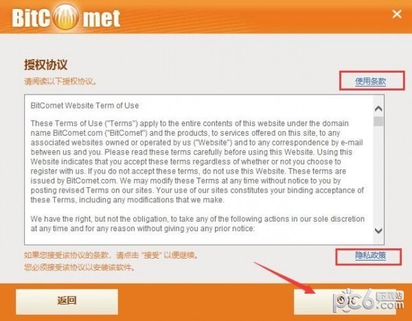 3、进入BitComet(比特彗星)安装协议界面,您可先阅读软件授权协议,并且可以通过点击右上角的“使用条款”和右下角的 “隐私政策”进行阅读,如无异议的话点击“接受”进入下一步。