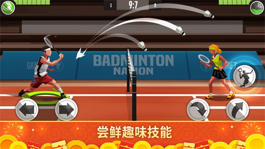 5、游戏的操作比较简单,屏幕左下角控制人物前进和后退,右下角操控近击、远击和扣球,你要抓住时机来选择不同的技巧来打击羽毛球,找到机会来一次炫酷的扣杀吧。