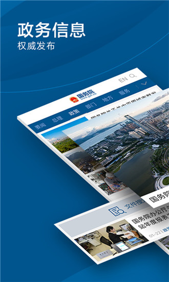 国务院app是由中国政府网运作中心专为广大用户提供的软件,使用这款国务院app可以及时接收政府发布的信息。现在国务院app已经开通全国35个省份,上百个城市的事实要闻,所有信息一目了然,通通呈现在你眼前。国院APP第一时间为你提供国务院发布的重大实时文件以及重要领导人的会议等等,是你了解政务发布信息最好的平台。