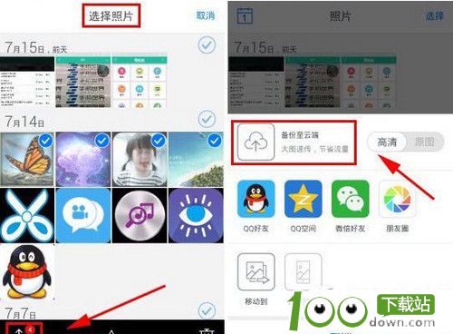 第二步、选择好相片并打【√】,点击【文件夹】上传,在提示框中点击【备份至云端】。