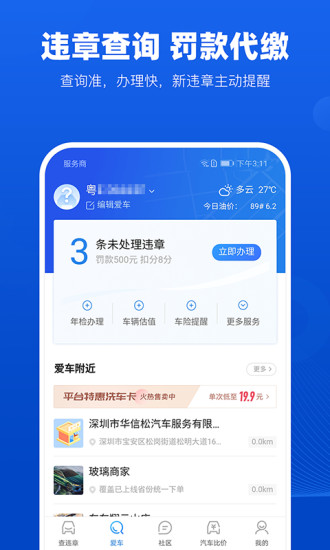车行易查违章app最新版以汽车违章查询服务作为核心,八年来朱家开拓了包含年检、维修、保险、加油等多项服务。这款软件专为车主朋友们设计制作,可以为广大车主带来真实有效的帮助。车行易查违章app最新版可以支持用户查看fu'gai覆盖全国400+城市的汽车违章信息,并且可以为用户智能定位违章地点。平台还可以为用户提供带来全新违章提醒,帮助用户在第一时间连接到自身违章数据。车行易查违章app最新版联合邮政服务开展车辆年检服务,可以帮助用户便捷进行年检代办。平台拥有着最为权威的违章数据信息,并且绝对保障用户信息安全。