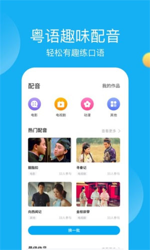 在这里面你还可以获取到海量的粤语资源来进行趣味的练习,各种港剧影视视频都可以获取进行配音,还有有趣刺激的闯关学习模式从多方面学习粤语。