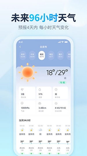4、24小时天气预报:当日天气趋势随心查阅。