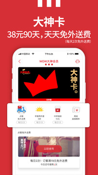- WOW会员大神卡:38元90天,可享:每日2次免外送费、每日1餐早餐两件套6折、每日1杯中杯咖啡10元!