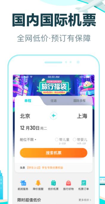 【机票】随时随地预订逾12.5万条国内国际航线机票,特价低至一折,轻松实现低价出行。
