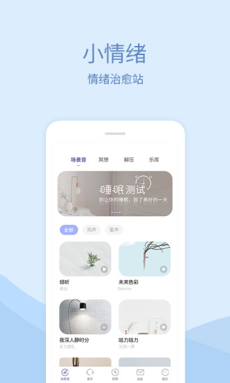 小情绪app破解版是一款能够帮助用户解决各种负面情绪问题的智能移动客户端。在这款软件中为用户准备了多种的白噪音以及能够帮助用户放松的旋律,用户使用软件听各种能够放松的声音,能够帮助用户快速沉下心来,小情绪app破解版能够帮助用户放空自己的大脑,使自己的身心能够得到放松。对于学业压力工作压力的人,情绪容易焦躁急躁的人,需要温暖陪伴的各种人群都能够使用这款软件来放松自己的身心。软件中还为用户准备各种趣味的测试,能够帮助用户更好认识自我。用户在软件中还能够设置专注模式,能够帮助用户提高自己的注意力,以便于能够提高自己工作以及学习的效率。这款软件还有着睡眠监测的功能,能够智能分析用户的睡眠状况,并生成相应分析报告,帮助用户能够拥有良好的睡眠。