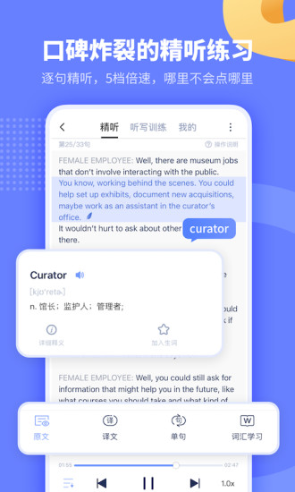 听力精听:泛听全文、听音变速划词翻译。更有科学美国人等丰富的听力资源,科学方法帮助考生提升托福听力成绩