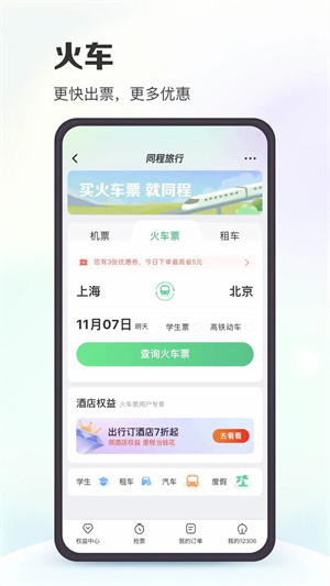 同程旅行app官方版下载完全都能给你们提供出优质出行方式的服务平台,让大家的出行无忧哦,大家会发现同程旅行app官方版下载上的这一些功能,特别的丰富好用,都是我们日常生活中所需要的,很多的一些时候,大家出远门或者是选择旅游出行的话,这里都能够满足大家的一些要求,解决大家的一些购票方面的问题,还有大家住宿的问题,都能够实现,随时随地是能够便捷的进行购票,大家输入自己的起点位置和终点的位置信息,就能查看到对应的一些车次,选择对应的时间,在这里购票,遇到一些节假日的话,你们都能选择提前的购票抢票,大大的增加了大家买票的成功率,所以整个的这一些服务很周全,特别的方便,所以大家赶快前来下载使用起来吧。