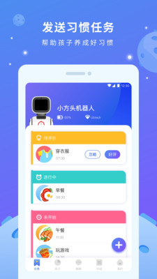 小方头app手机版下载这是一款家长育儿的好帮手,与科技机器人结合,会碰撞出什么火花呢?孩子与小方头机器人一起学习教育,家长发送习惯任务,帮助孩子养成生活好习惯。输入指令,如穿衣服、吃早餐、玩游戏等等,小方头和孩子一起快乐成长,互相离不开。查看任务统计,了解孩子的行为情况,了如指掌。亲子间有效沟通,视频电话更亲近,随时随地联系孩子,与之沟通。点播海量内容资讯,在听听中学习知识。远程管理机器人,绑定配网轻松搞定。科技改变生活,造福人类。