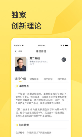 混沌大学app手机版是一个创新型的创新者的互联网大学手机软件,如果你想学创新,就一定要来下载混沌大学app手机版,这里有最独家的创新好课让你趣味学不停,柘林的独家创新学科,收录了超过500例成功的商业案例课,让你在这里就能够一站学遍“当下的创新”,同学圈功能让你与混沌同学一起交流互动,关注自己喜欢的同学还能够一键获取同学的最新状态,还有超过三十万的校友、线下还拥有17家城市学习中心,各种线下精彩活动陪伴你一路成长,希望在这里你能学习到最有用的知识、结交到最靠谱的朋友、解决最实际的问题、拓宽你的思维框架、认识到更加广阔的世界。
