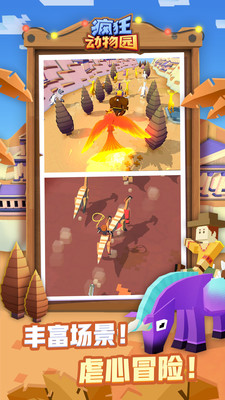 《疯狂动物园》是一款集3D像素、急速跑酷和模拟经营为一体的休闲小游戏。在游戏中你将扮演一名富有冒险精神的绝世牛仔。在高速移动的情况下与各种动物一较高下。你要尽可能多的套住动物,将它们统统带回飞船上的“空中动物园”中饲养;并进行园区升级,以便迎来世界各地的游客光临赚取更多金币。 Now,让我们去好好大干一场吧!