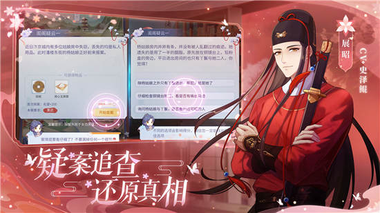 在梵花录破解版,玩家将穿越回北宋,化身成为一名捕快,在悬疑案件和线索推理中,结识展昭、白玉堂、庞昱和赵曙这四位身份、性感各不相同的男主,并与他们展开一段奇幻的穿越之旅。玩家还可以通过书信、约会、赠礼、互动等方式,来提升知己好感度,从容可以解锁更多的专属邂逅剧情哦。梵花录破解版中的案件都是由真实古代案件改编而成,玩家需要结合自己的判断,寻找各种线索,一步步探查到案件的真相。喜欢探案推理的小伙伴,千万不要错过哦。