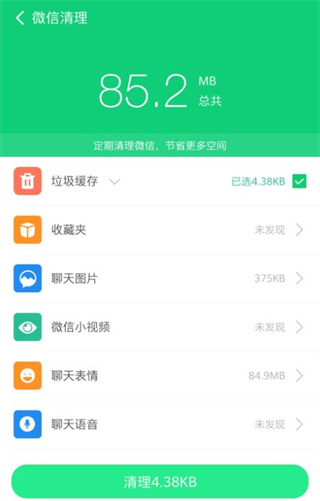 2、微信应用产生的各种垃圾都能轻松清理,如朋友圈小视频、语音聊天文件等。