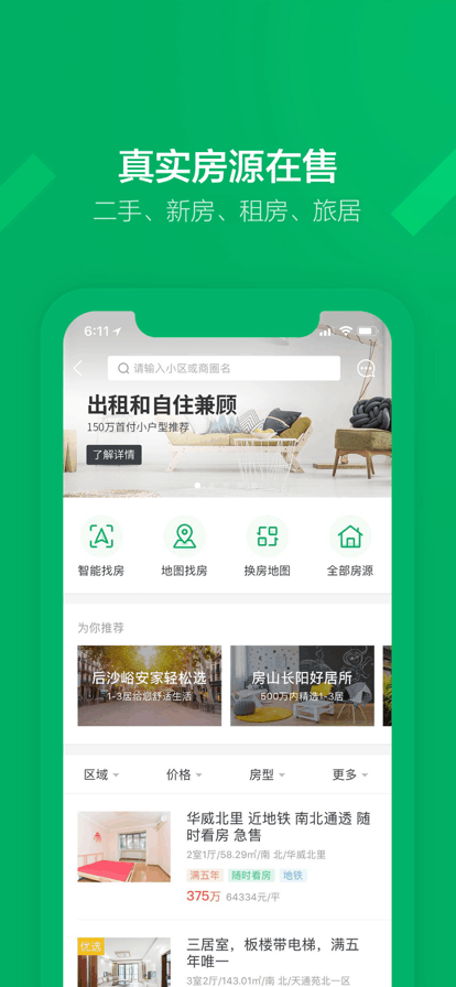 集房屋交易与家装服务于一体的手机软件,拥有二手房、新房、租房、装修、商铺办公、卖房、查首付等众多板块,连接每个家的故事