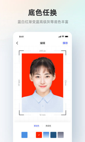 还有美颜滤镜功能,不用担心证件照不够美。有白红蓝三种底色供你选择,轻触需要的颜色即可换背景,制作美丽又符合要求的证件照。