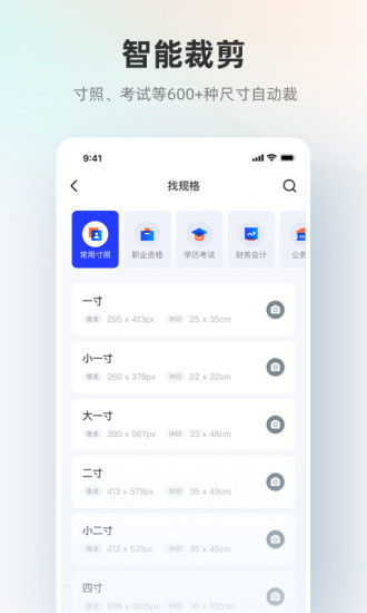 软件中尺寸规格齐全,一寸照、二寸照、各种考试证件照、旅游签证证件照、工作证件照等等覆盖工作学习中的各类证件照的使用场景,我们都能满足