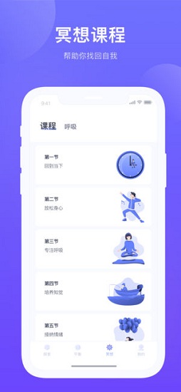 4、开辟冥想板块,用户可以自定义时长和冥想的背景,还新增众多的佛教音乐,结束时的西藏的钟声使户重返俗世,结束冥想。