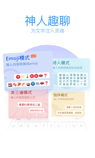 QQ输入法手机版是一款高效、智能的手机输入法,可以提供的打字模式非常多。常见的几种输入方式,QQ输入法手机版都支持。诸如五笔输入、全拼、手写、笔画等等。另外QQ输入法手机版也支持斗图、换肤等这些深受用户喜欢的功能。