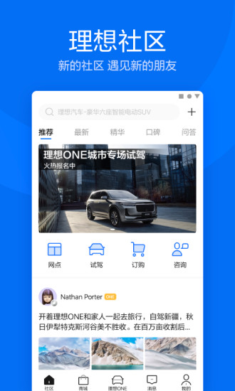 3、社区:理想车友发布最新车辆体验信息,官方工作人员发布最新车辆资讯,车友问答互动,参与社区活动与话题,加关注即可了解好友的最新动态。