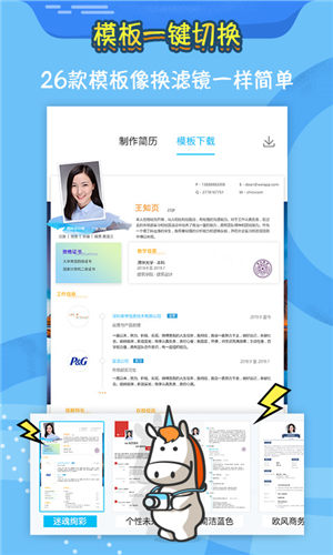 2、数十款简历模板一键切换像美图秀秀切换滤镜一样简单,自动生成的完美简历排版。