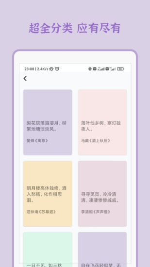 句绝app官方版是一款精选句子阅读软件。在句绝app官方版里面拥有超多精美句子,上百种句子文案分类,用户可以搜索查看到自己喜欢的句子类型,将它收藏起来,可以在日后文案编辑和文章写作时使用。喜欢这款软件的用户,欢迎前来下载使用。