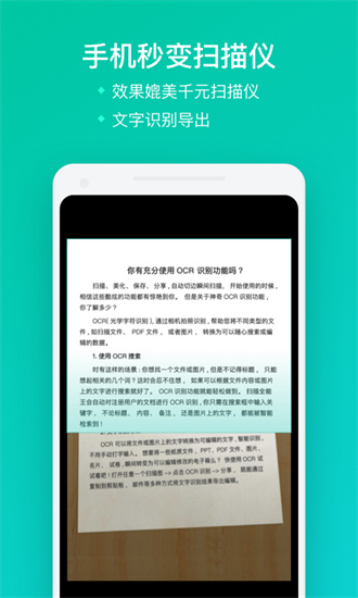 扫描全能王手机版免费版下载是一款可以去自由扫描文字、生成文档图片的手机app,扫描全能王手机版免费版下载中的界面很是好看,在app中你将可以去极速拍照获取需要的文字,可以去上传到云盘和好友分享协同办公。扫描全能王手机版免费版下载中的内容支持多端云查看,编辑、导出都是很方便的,免费的使用体验给你极致享受,非常适合学生和职员使用,功能强大,导出快速,给你极致沉浸功能体验。