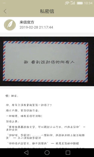 经常在来信中浏览别人的公开信件,自己也会和在远方朋友在就进行互通消息,增进双方的关系,这种方式还是比较新奇有趣的。在来信中还能随时查询信件,也可以加入笔友圈,是很好的社交方法,推荐给大家。