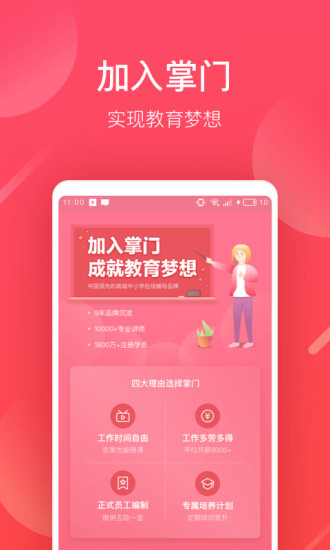 掌门好老师app最新版是能够进行一对一的进行家教辅导的手机移动课堂类型的教育服务类型的软件,在这里面有着非常便捷的教育移动内容,让你可以在这合理尽情的与其他的教师们进行交流,还能够管理你的课程方案。在掌门好老师app最新版上,这里面为你提供了非常多功能特点,让你可以在这里感觉到非常的方便,里面有着非常多优秀的老师们都在分享着自己的教学经验,让你可以在这里与他们相互的沟通,来完成各种各样的文化内容,在这里还有着非常多关于为教师提供的题目内容,还有各种教育行业的动态,帮助你更好的进行聊天教育这个行业,快来下载掌门好老师app最新版吧。