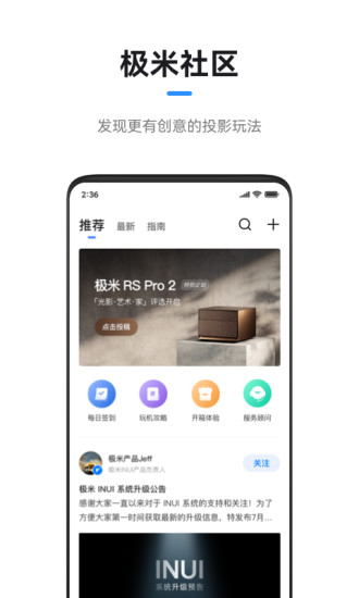 我们还设立了极米社区和官方商城,你可以将自己使用投影仪的感受分享这里或者获取海量的商品测评。也可以从这里购买到更多优质投影商品。