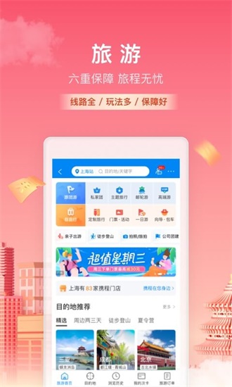 携程旅行app官方正版下载是一款十分好用便捷的出行软件,用户使用了它,一个手机搞定出行的吃穿住行所有的一切,大大方便了用户出门工作或者旅行娱乐。携程旅行app官方正版下载作为最热门的出行旅游娱乐软件,这里拥有最好最全的出行服务,以及完美的娱乐指南。在这里你再也不用担心出行住宿的问题,软件在线查找目的地的酒店旅馆在线预定,到达即可办理入住。吃的方面,用户再这一键查询最好吃最有特色的当地美食,让你感受舌尖上的美味。休假时间不知道去哪里游玩,i可以一键查询周围景点,提供线上买票服务带上好友,享受愉快的假期。出行工具上它也可以安排的妥妥当当,飞机火车票都可以再软甲上购买,一键查询,没票也不怕抢票功能在线随时抢票。这么好的生活出行软件快来下载体验吧。