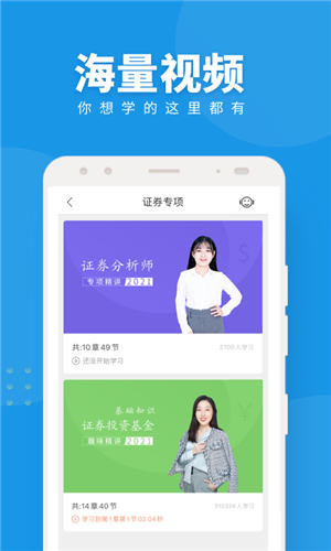 证券从业随身学app安卓版是一款专注于证券从业教学的知名教育平台。软件内拥有着专门针对证券考试的精品视频课程及优质试题内容,支持用户进行在线视频的查看及分章节的真题在线模拟。证券从业随身学app安卓版按照证券考试的不同知识点进行了清晰的教学章节划分,为用户提供了包含ppt演视文稿,视频课程,真题模拟等多样化的自由训练方案。用户可以通过证券从业随身学app安卓版来进行有效的业余时间利用,随时随地的进行证券知识的巩固与学习。这是6000万证券考试从业者最为信赖的证券从业教育平台,以其优质的内容及完善的服务而赢得了用户们一致的好评。