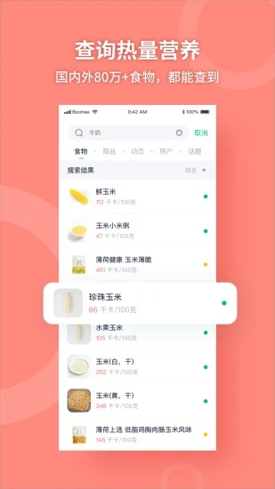 - 海量食物数据库,热量、营养成分随时查,吃得明白