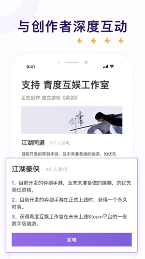 爱发电app官方下载是个交流社区平台,在这款社区平台里,拥有大量的作者进行创作,也有大量的粉丝在平台上进行热烈的支持,让粉丝和他们的作者进行友好的互动,平台上yy的作者各式各样,有音乐制作人或者小说作者、游戏开发者或是画师等等,只要是进行创作的作者都可以来平台上获得支持,叫上自己的粉丝过来进行交流吧,在平台上的用户可以发送任意的金额给作者进行支持,作者会受到粉丝的这份感谢,让作者更有动力,也有许多的作者自己设置好了金额和与之对应的不同奖励,比如画师提前让粉丝看自己的最新作画,或者是游戏作者将粉丝的名字记入其中,喜欢的朋友赶紧来看看吧。