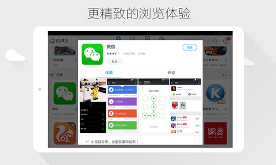 应用宝HD版是腾讯应用中心为平板用户打造的应用商店,提供多元化的软件游戏下载服务,可以满足用户日常的需求。具有安全、靠谱的特点,全方位覆盖用户的下载、管理、收藏、分享等多样化的需求体验。