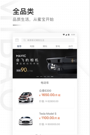蜜宝二手手机分期租赁商城app目前汇集了包括大疆、东芝、康佳等优质数码品牌入驻商家,包括苹果、特斯拉、大疆、gopro、索尼、尼康等多款高端数码品牌商品。APP通过整合优质货源渠道,配之以完善的风控体系,以及内容化、本地化的配套服务体系,联手菜鸟、顺丰等优质物流服务商,提供优质的全品类租赁服务。