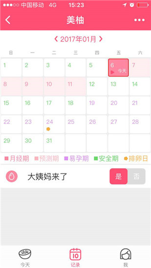 1.经期记录功能:点击手机界面下方的-记录后会跳转到类似日历的界面,在日历上选择你上月来姨妈的时间后在选择其周期即可得知正常情况下本月经期时间,在所有选项选好后点击右上角的分析就能知道自身状况,该板块还有备孕期、怀孕期、育儿期三个模式供你选择。