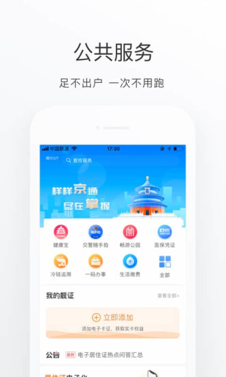 北京通最新版本是一款能让北京地区居民用户们享受便捷生活的手机软件,对于北京大大小小的事情以及政府服务等等都能做到样样精通,北京各种事情以及服务都尽在掌握之中哟。北京通最新版本为用户们提供了电子卡证,即使用户们出门忘记携带纸质证件了也无妨,随时都能打开平台出示自己的电子卡证哟,在平台里用户们可以进行生活缴费服务,还能畅游各种公园,医保凭证为用户们提供着,各种北京重要的事情变化等都在公告栏里,用户们打开平台的第一眼就能收看到了,它还为用户们提供了全程的电子化政务办事服务,一站式的办理让用户们足不出户哟!办事效率非常的便捷且快速,用户们快来下载吧!