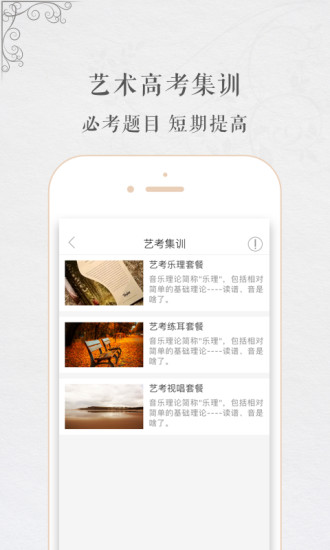 1、精心设置了艺考集训课程,为艺考生量身打造专业课程,海量的乐理知识和讲义实践等内容,全面的提高综合实力;