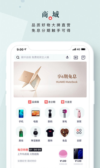 2、“发现”:分期理财、卡片精彩、饭票、影票、积分玩家、掌上商城、机酒火车、旅游海购......八大电商频道全程为您提供丰富优惠的商品