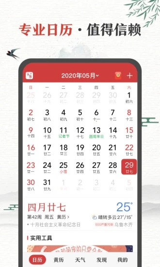 中华万年历最新版是一款人均用户都在使用的独家软件。中华万年历最新版简单的使用功能随时方便用户们的查看与体验哦,随了解今日气运变化。多个板块更多精彩等你即时发现与体验。支持天气预报的在线查询哦,方便随时了解当天天气状况内容,随时为出行提前准好准备哦。还能随时在日历上标记自己特殊的日子,在线提示让你用户不在错过。并且还能随时查看农历日历哦,求姻缘,算吉日,出行求签,随时都鞥等你免费体验哦。超多个性界面主题精彩,多种皮肤款式等你随时下载自由体验哦,超多常用小工具,等你下载享受乐趣独家体验。