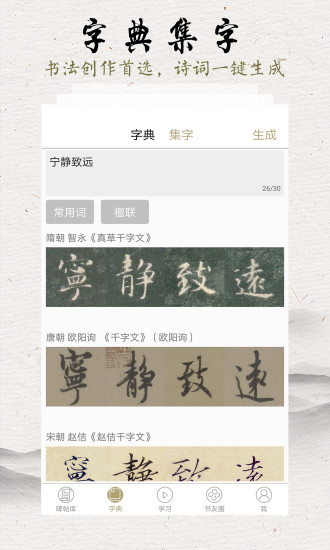 在这个软件中拥有超级多书法资料和高清拓片可以免费获取和浏览,同时你也可以进行练习活字帖,并且将自己的作品分享到书友圈相互学习。