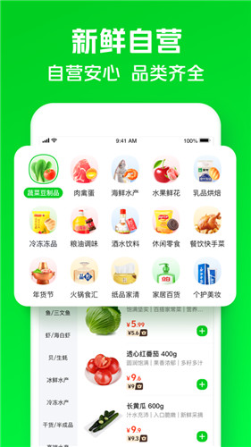 新鲜蔬菜、水果、肉禽蛋、米面粮油、水产海鲜、方便速食,解决一日三餐所需食材!