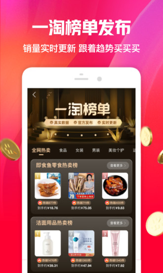 一淘app免费版官方下载是一款由阿里巴巴旗下研制的省钱返利大额优惠购物软件,一淘app免费版官方下载作为促销类导购平台,通过大额优惠、购物返利、大量红包等促销活动手段,为爱省钱的用户提供性价比最高的购物体验,是不少喜爱网购却囊中羞涩的用户购物神器。如果你想要买到足够便宜性价比也要高的商品的话,下载一淘是最不容错过的选择。你的每一次下单都可以得到一定的商家返利,这个返利会作为一种一淘专属货币集分宝发放,在你下次进行购物时,集分宝就可以作为现金货币使用抵扣一定金额的扣款。当然一淘不仅有着大额返利,还有着大量的超级优惠券,各种品牌商品的专属红包优惠,还有最经典的限时白菜价抢购超级大品牌,为你的每一次购买都带来最舒心的体验。快邀请你的好友一起下载吧,更有大额专属邀请福利等你来拿!