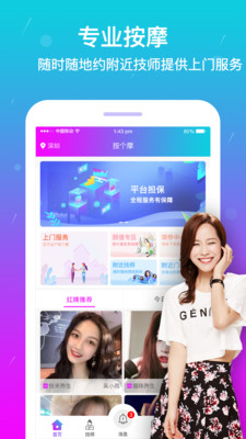 按个摩app是一款可以提供上门按摩的软件,如果大家不方便去店面消费的话,可以在app上面选择喜欢的技师,给你提供上门。