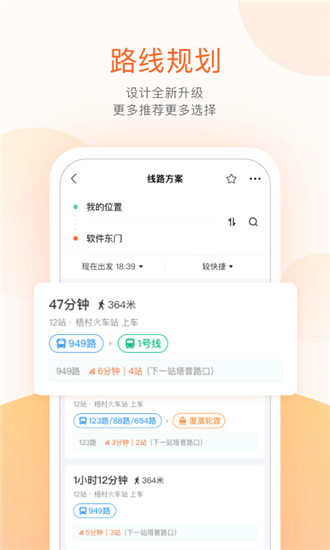 【路径规划】提供公交出行的路线及换乘方案,提供多种换乘方案,支持回家、去公司等常用地点收藏,步行换乘段的步行导航。