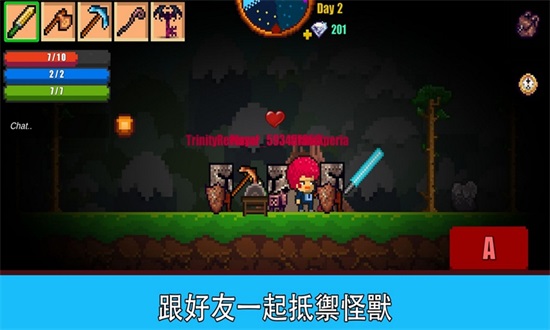 1、收集木头、各种矿石来打造各种东西,与其它的玩家一同联机玩,一同合作生存